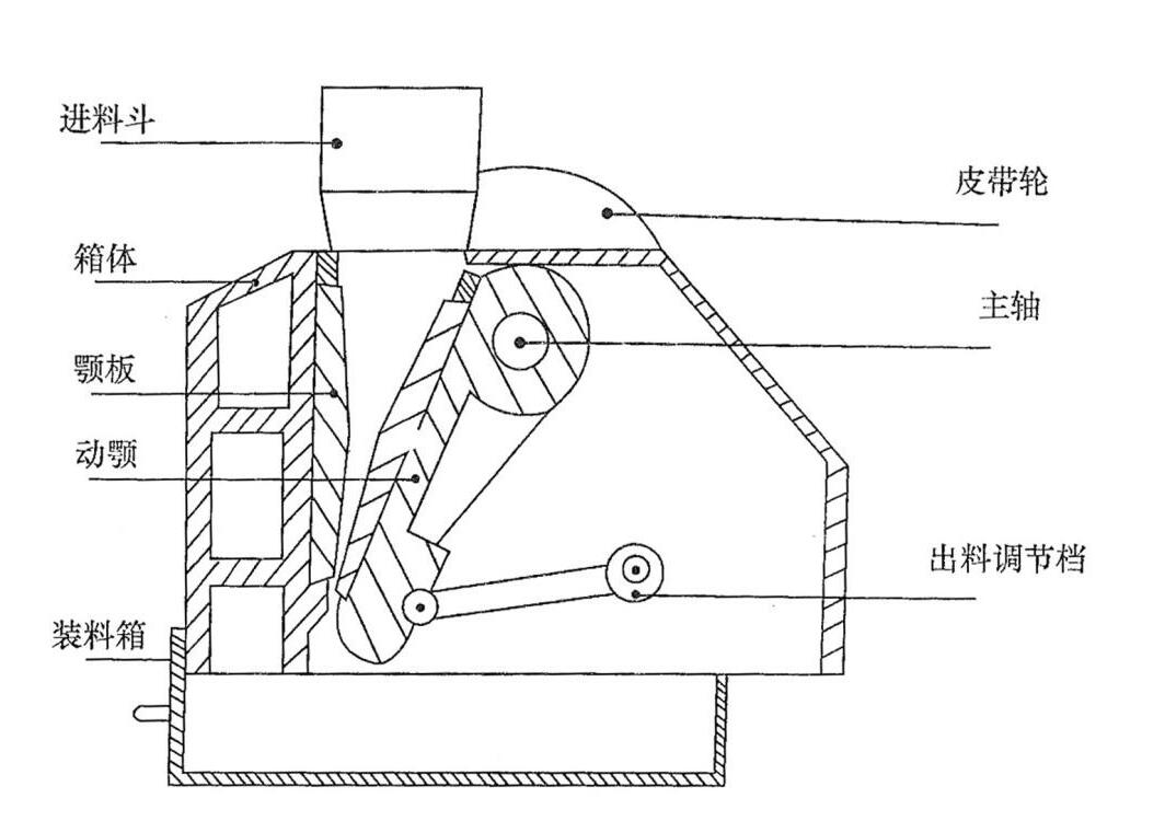 本機(jī)由機(jī)架、動(dòng)顎、偏心軸、顎板、肘板等部件組成。電動(dòng)機(jī)通過三角皮帶傳動(dòng)偏軸,使動(dòng)顎按照已調(diào)整好的軌跡進(jìn)行運(yùn)轉(zhuǎn),將破碎腔內(nèi)物料予以破碎。
